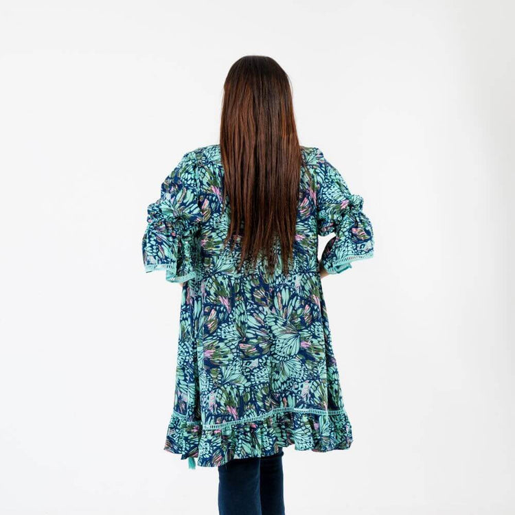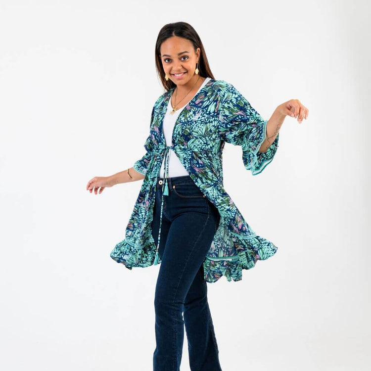 El Kimono Ágata es una prenda ligera y fluida confeccionada en New Saari (tejido inspirado en la seda india), ideal para quienes buscan un estilo libre y versátil. Su diseño con mangas amplias y volantes aporta un aire bohemio elegante, perfecto tanto para acompañar looks casuales como para elevar cualquier conjunto.