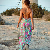 Vestido largo de espíritu bohemio confeccionado en tela New Saari, con delicadas lentejuelas integradas que aportan luz y movimiento sin perder ligereza. Su escote favorecedor y el diseño fluido estilizan la silueta, mientras la caída suave acompaña cada paso con naturalidad.