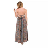 Vestido largo de espíritu bohemio confeccionado en tela New Saari, con delicadas lentejuelas integradas que aportan luz y movimiento sin perder ligereza. Su escote favorecedor y el diseño fluido estilizan la silueta, mientras la caída suave acompaña cada paso con naturalidad.