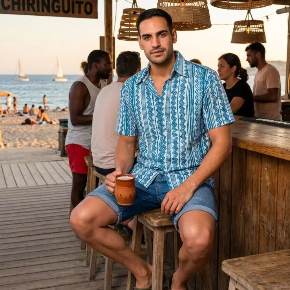 Una camisa de hombre de mangas 3/4 con cuello mao que evoca la suavidad de una acuarela sobre lienzo. Su estampado combina armoniosamente tonos de azul, creando un efecto visual sereno y orgánico, como una pintura inspirada en la naturaleza. Ideal para quienes buscan una prenda con personalidad, cómoda y con un aire artístico.