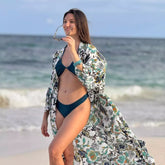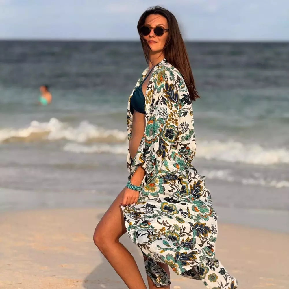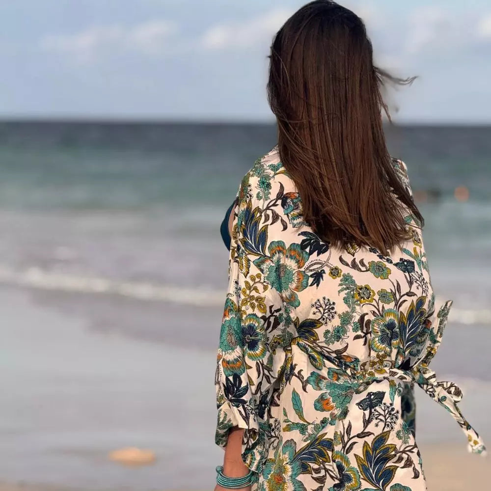 Gracias a su diseño amplio con cinturón ajustable, puedes llevarlo como capa abierta, vestido ligero, complemento para la playa o incluso como deshabillé para esos momentos de relax en casa o en vacaciones. Los estampados exclusivos de esta colección evocan la energía del verano, la naturaleza y la alegría de vivir, convirtiéndolo en una pieza imprescindible para dar un toque único a cualquier look.